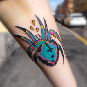 I enjoy doing bold traditional style tattoos with a twist but I also enjoy doing abstract works like brushstroke tattoos.